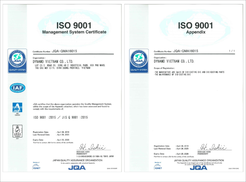 Dynamo Vietnam Co., Ltd. has successfully obtained the ISO 9001:2015 Quality Management System Certificate, awarded by the Japan Quality Assurance Organization (JQA).
